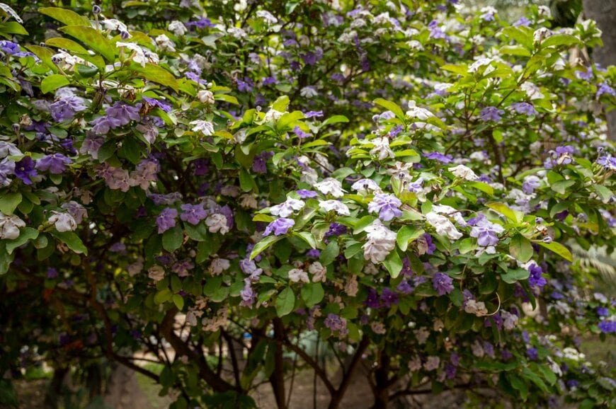 春から初夏にかけて、シンプルで愛らしい花を咲かせる常緑樹・ニオイバンマツリ。花の咲き始めは紫、途中で白に変わるユニークな特徴を持っています。