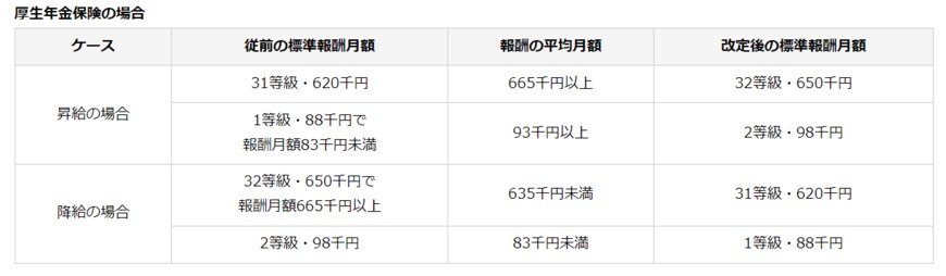 また標準報酬月額等級表の上限または下限にわたる等級変更の場合は、2等級以上の変更がなくても随時改定の対象となります。