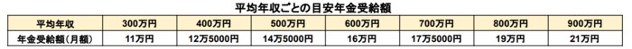 参考までに、厚生労働省「公的年金シミュレーター」をもとに試算した、1970年生まれの会社員が23歳から60歳まで勤務した場合に、65歳から受給する平均年収ごとの年金受給額は以下のとおりとなります。