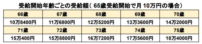 【繰下げ受給】受給開始年齢ごとの受給額(65歳で月10万円の場合)