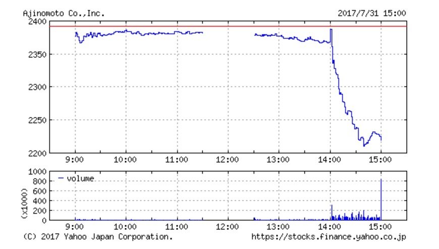 味の素が後場の決算発表後に大急落、日立製作所は急騰して高値更新