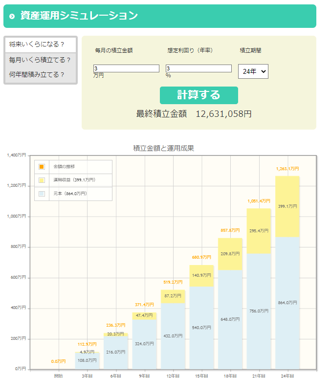 - 24年目(64歳) :1263万1000円(運用収益399万1000円)