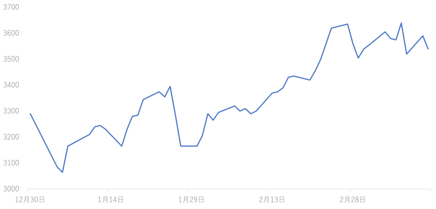 2022年最終営業日となる2022年12月30日の終値は3290円で、2023年3月14日の終値は3540円なので、約7.6%上昇しています。