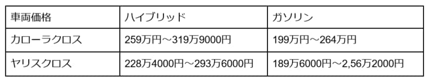 【カローラクロスとヤリスクロス】車両価格の違い