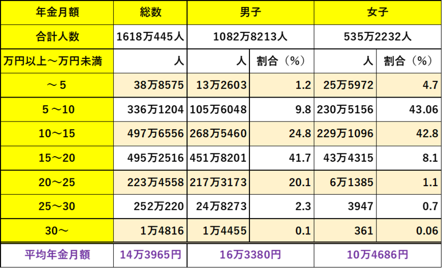 実際に男女別で「どのくらいの人」が「どのくらいの年金額」をもらっているのか確認できます。