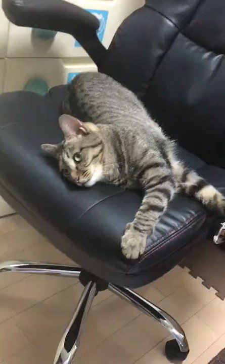 動画の冒頭には、キジトラ柄の先住猫「メロン」くんの姿があります。メロンくんはイスの上で横たわり、微動だにせず一点を見つめていますが……?