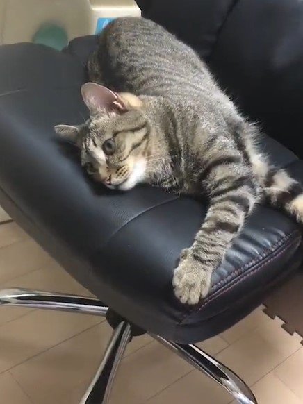 そして、メロンくんはというと……?動画の冒頭と変わらぬ格好と表情で、イスの上に寝そべっていました。