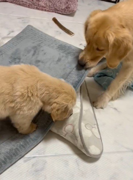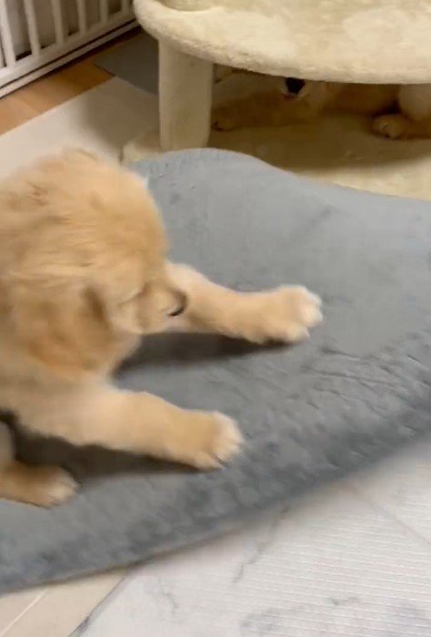楽しそうな光景に魅了されたのか、もう1匹の子犬もやって来ました。2匹が揃ってマットの上に乗ると……?