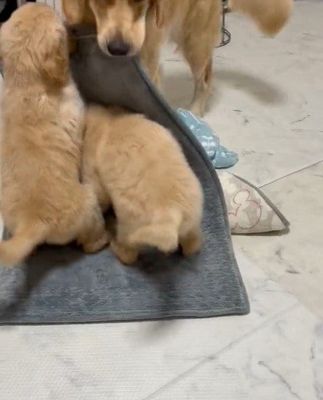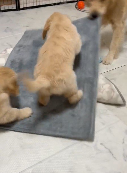 次の瞬間ぷぅちゃんは、マットを反対方向に向かってクイッと持ち上げます!「やっぱり重いよ~!」なんてセリフが聞こえてきそう!子犬たちも大はしゃぎで、親子そろって楽しそうにする姿が元気をくれますね。