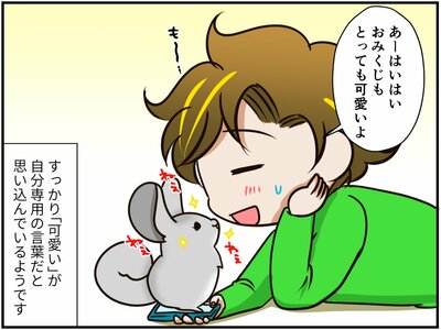 そんな勢いでおみくじちゃんを毎日「可愛い」と愛でる祭さん。元々チンチラは賢い動物なので、おみくじちゃんは「可愛い=おみくじ(自分)」だと解釈しているようす。