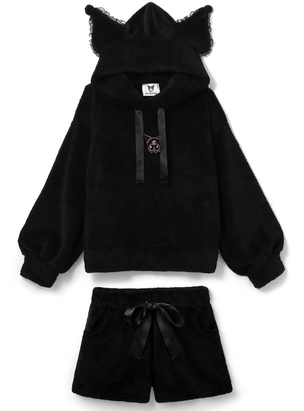 クロミの耳がついた、かわいいセットアップタイプのルームウェア。もこもこ素材にボリュームスリーブを採用するなど、女性らしさ満載のアイテムです。サテンのリボンやフロントの刺繍など、ディティールにもこだわりがつまっています。小悪魔キュートなクロミになりきれると評判です。