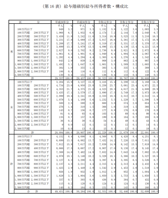 国税庁が公表する「2021(令和3)年度の民間給与実態統計調査に」よると、1年を通じて勤務した給与所得者 5270万人についての給与階級別分布は、300~400 万円以下の者が 914 万人(17.4%)です。