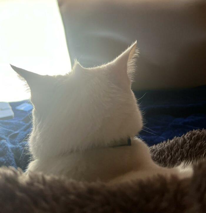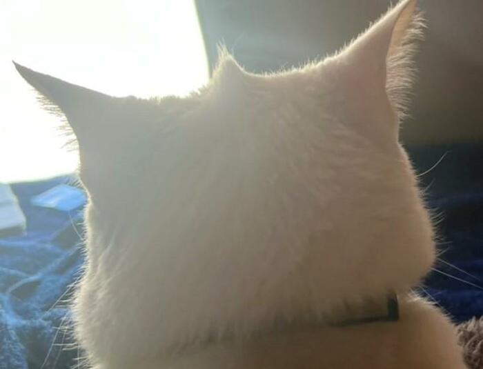そして猫さんの頭部をよく見てみると……?両耳の間に「小さなツノ」が生えているかのような、なんとも愛らしい寝ぐせがついていました。