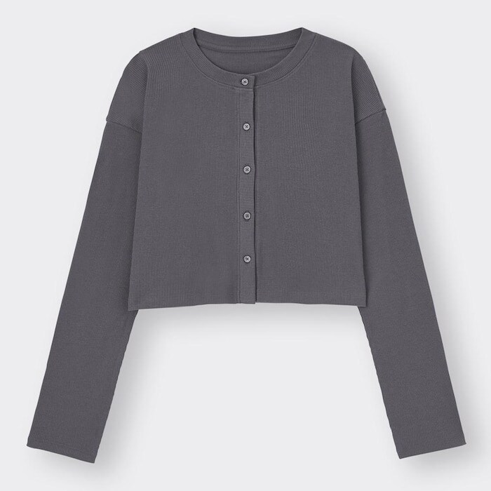 カーディガンはトレンド感のある短め丈となっています。リブ素材なので着心地も良いです。