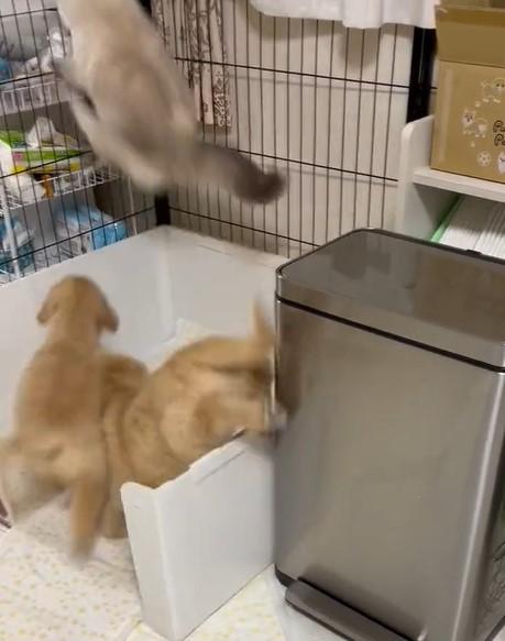 ワンちゃんのもとを後にしたお茶子ちゃん。猫らしさを感じる軽やかなジャンプでケージを飛び越えていきました。