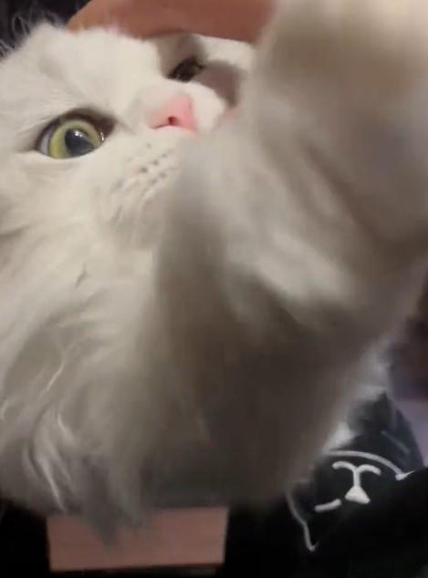 しばらくすると、飼い主さんの手が視界に入った様子のノーマンくん。雲のようにフワフワなおててを使って、飼い主さんの手を掴みました。