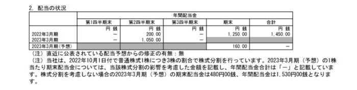 日本郵船の株式を1年前に買い、持ち続けたとすると、「2022年3月期の期末配当と2023年3月期の中間配当」の計2回を受け取ることができます。