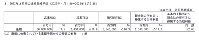 トヨタ自動車株式会社「2023年3月期第3四 半期決算要旨」によると、2023年3月期の連結業績予想は親会社の所有者に帰属する当期利益で2兆3600億円(前期比▲17.2%)です。