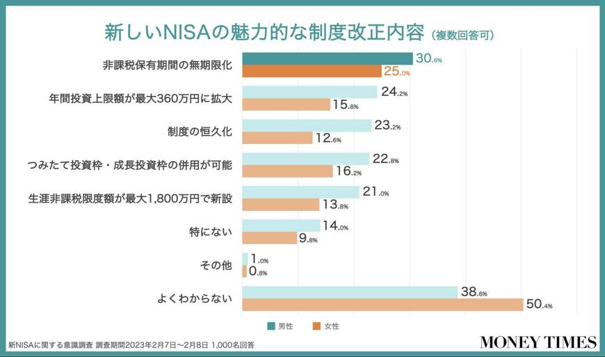 男女ともに新しいNISAの魅力的な制度改正内容として、「非課税保有期間の無期限化」が1位に挙がりました。
