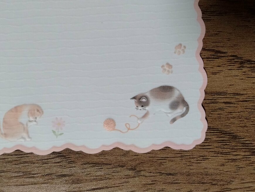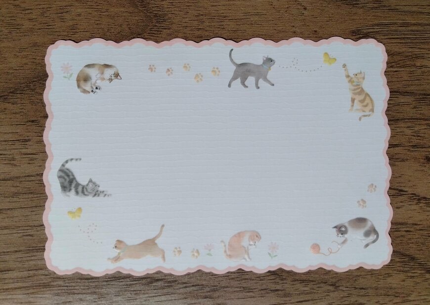 便箋には7匹の猫がデザインされています。蝶を追いかけたり毛づくろいをしたりしている猫たちが愛らしいです。