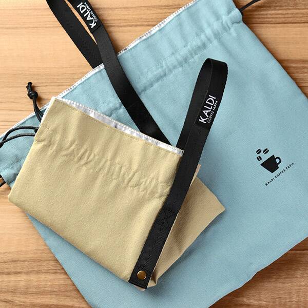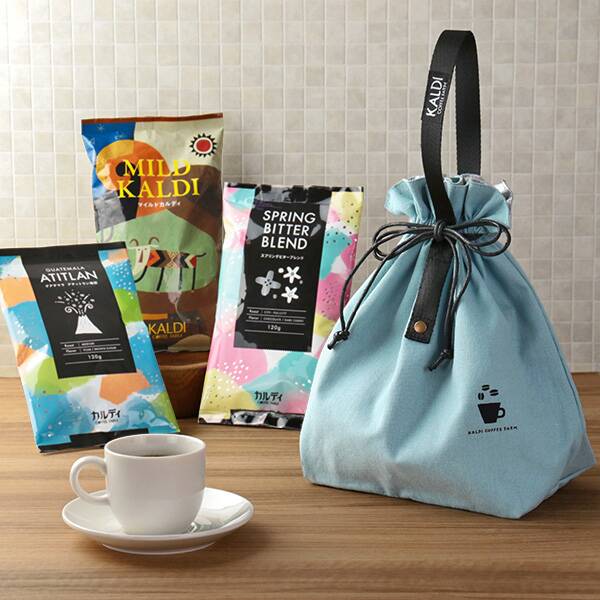 春を感じられる味わいのコーヒー3種と巾着タイプの保冷バッグのセット。コーヒーは一番人気の「マイルドカルディ」、春のコーヒーバッグ限定「スプリングビターブレンド」「グアテマラアティトラン地区」の3種。