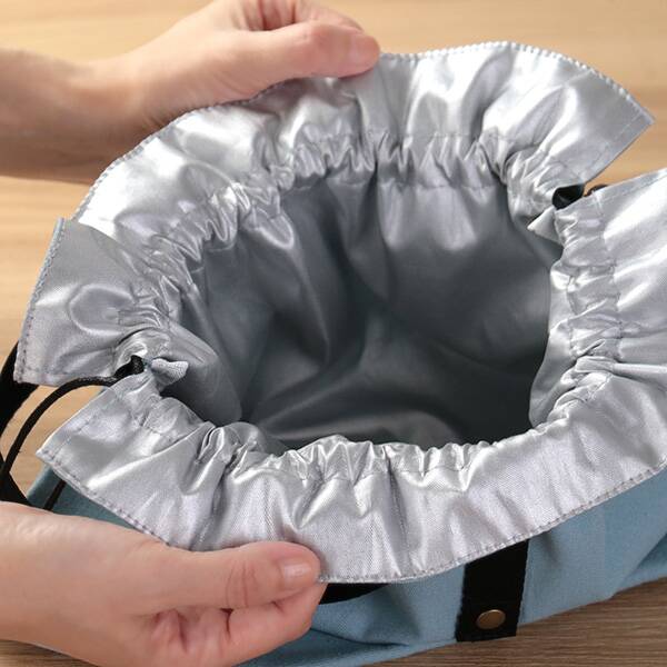 バッグは巾着タイプの保冷バッグで、日々のお弁当やピクニックなどちょっとした場面で使えるコロンとしたかわいいデザイン。折りたためるので持ち運びにも便利!