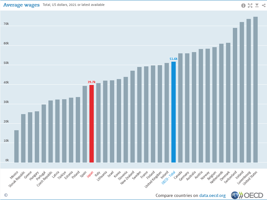 また、OECD加盟国の平均年収の値は5万1607ドル(年収568万円前後)であるのに対し、日本人の平均年収3万9711ドルです。