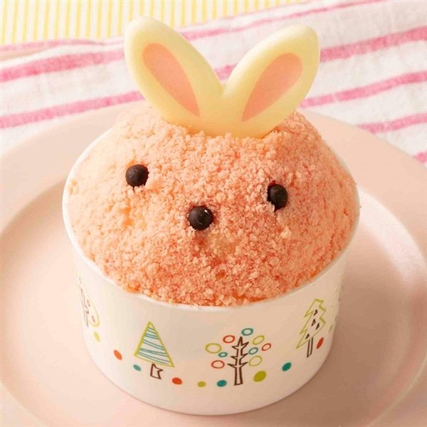 動物のうさぎちゃんをイメージしたスイーツです。苺風味スポンジクラムが表面にふりかかっています。シリアル入りチョコとホワイトチョコレートで顔を飾り付けた、お子さんたちからに喜ばれる動物モチーフのミニサイズケーキです。