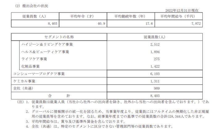花王の給料はいくらか。平均年齢・勤続年数も【2022年更新版】 就職と転職の企業調査・分析シリーズ 2023.03.29 03:50 公開 執筆者LIMO編集部 copy URL 目次[開く] 1. 花王の平均年間給与はいくらか 2. 花王の従業員数は何人か 3. まとめにかえて 参考資料 1. 花王の平均年間給与はいくらか 花王(提出会社)の2022年12月末時点での従業員数、平均年齢、平均勤続年数および平均年間給与は以下の通りです。 出所:花王「有価証券報告書」 すべての画像を見る(2枚) 従業員数:8403人 平均年齢:40.9歳 平均勤続年数:17.6年 平均年間給与:787万2000円 ※平均年間給与には、賞与及び基準外賃金が含まれます。 2. 花王の従業員数は何人か < 1 2 3 4 > 関連タグ #就職 #花王 #給与 #年収 注目コンテンツ 持病があっても入りやすい医療保険。人気の保険はこの保険![PR] 【キャラつくAI】プロフィールをもとにAIがあなたをイメージして絵を描きます![PR] 【LIMOで懸賞】新しいプレゼントが続々登場中!最新情報はこちらから[PR] あわせて読みたい