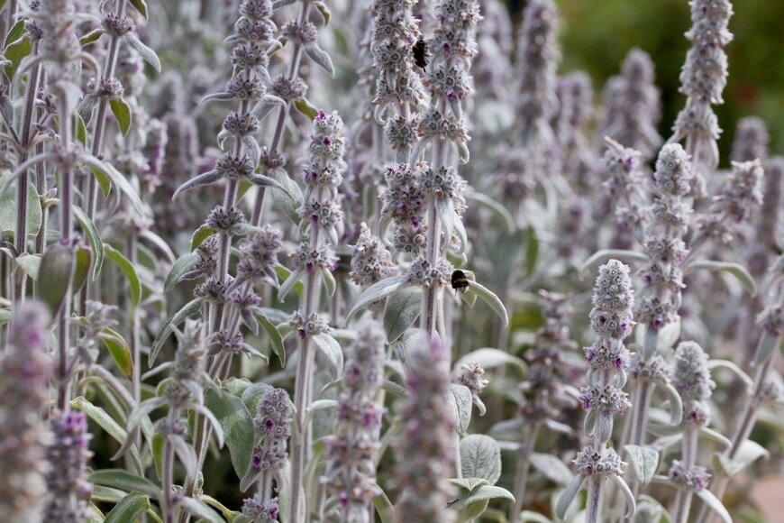 春から初夏にかけて紫色の小花をつける多年草・ラムズイヤー。直訳すると「羊の耳」となり、名前の通り茎・葉ともにふわふわした白い毛がキュートな植物です。