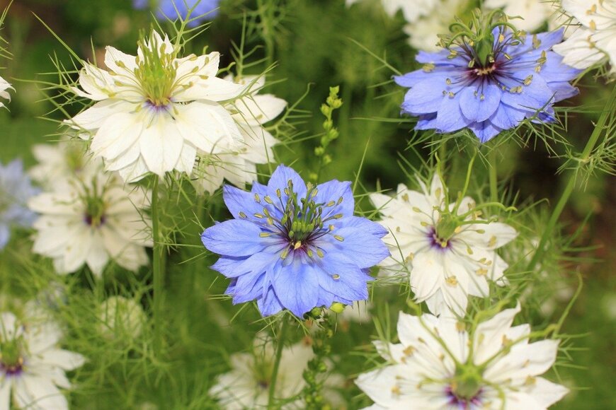 春から初夏にかけて開花する一年草で、青系・白・ピンク系の花色があります。開花後に花が膨らみ、黒い種を放出させることから「クロタネソウ(黒種草)」とも呼ばれることも。