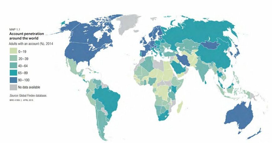 先に、中国の銀行口座保有率について紹介しましたが、全世界では成人20億人が銀行口座をもたず、その大半が発展途上国に住んでいます。先進国との対比では、先進国では成人の89%が銀行口座を保有する一方で、途上国では41%にとどまるなど、両グループで銀行サービスの利用しやすさに大きな隔たりがあります(世界銀行、2015年)。