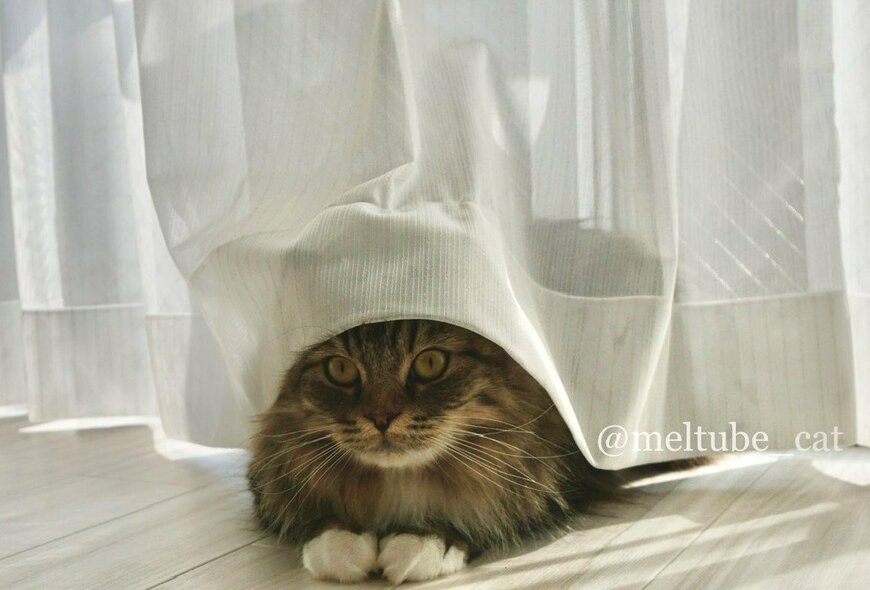 白い被り物を身につけるかのようなチャーミングな格好をしながらも、表情はキリッとしているメルくん。ふわっと頭に乗るカーテンを心地よく感じていたのでしょうか。