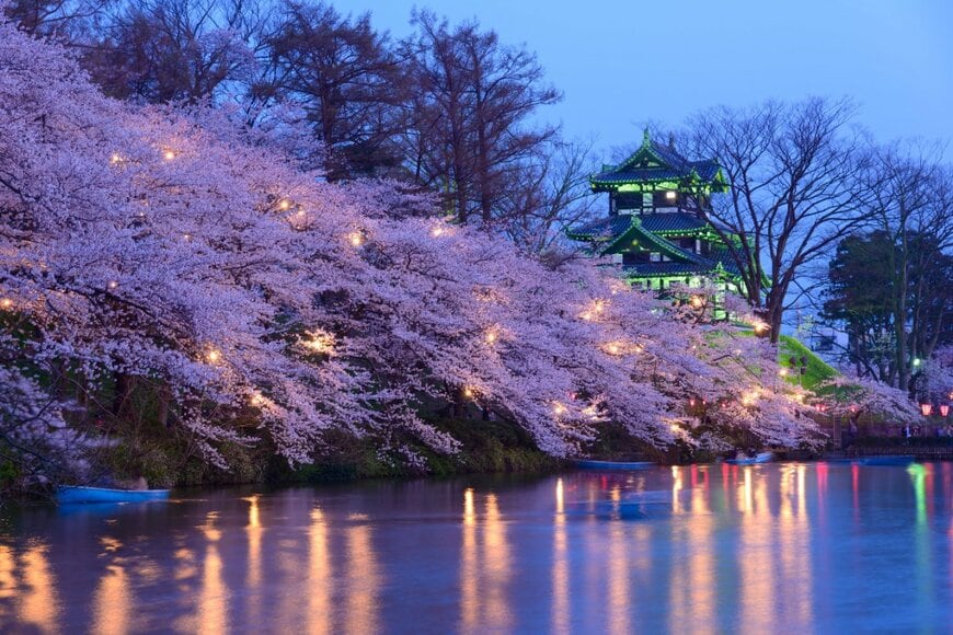 ランキング4位となったのは「日本三大夜城」の一つに数えられる「高田城址公園」。桜と三重櫓が照らされて、お堀の水面に浮かび上がる様は圧巻です!