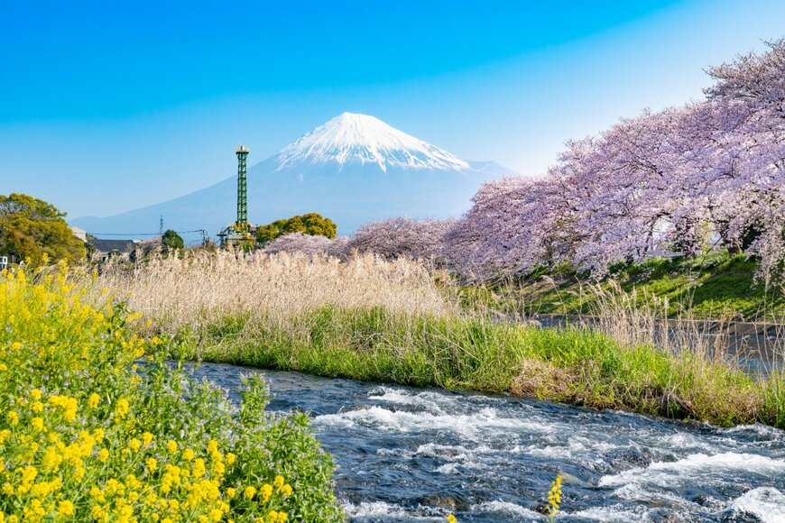 桜と菜の花、清流、さらに残雪の富士山が一体になった風景は、日本らしさを存分に感じられる、心に残る春の絶景です。(※駐車場がないため、公共交通機関をご利用ください)