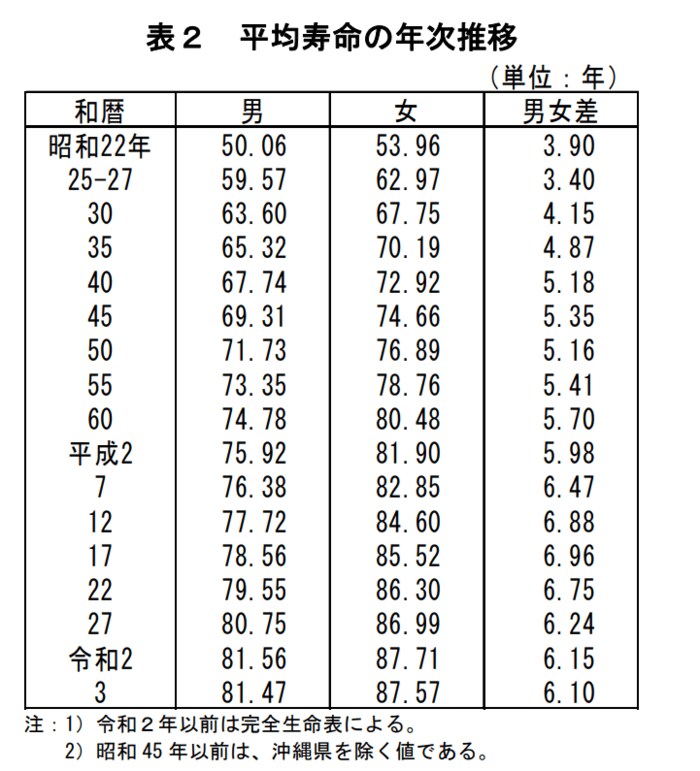 2021年の平均寿命は男性81.47歳、女性87.57歳と、1975年の男性71.73歳、女性76.89歳から約10年伸びています。