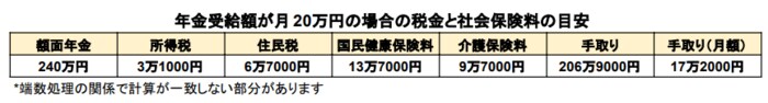 年金受給額が月20万円(年240万円)の場合に天引きされる税金と社会保険料は以下のとおりです。