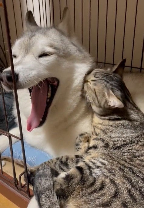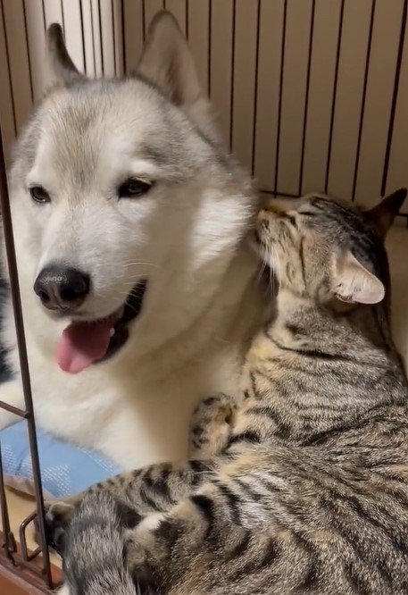 「相思相愛」というコメントとともに投稿されたのは、1本の動画でした。注目を浴びているのは、ハスキー犬の「ユキ」ちゃんと元保護猫の「サン」くんです。