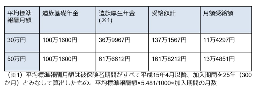 平均標準報酬月額が30万円の場合に受給できる遺族年金は月11万4297円(年137万1567円)、50万円で月13万4851円(161万8212円)でした。
