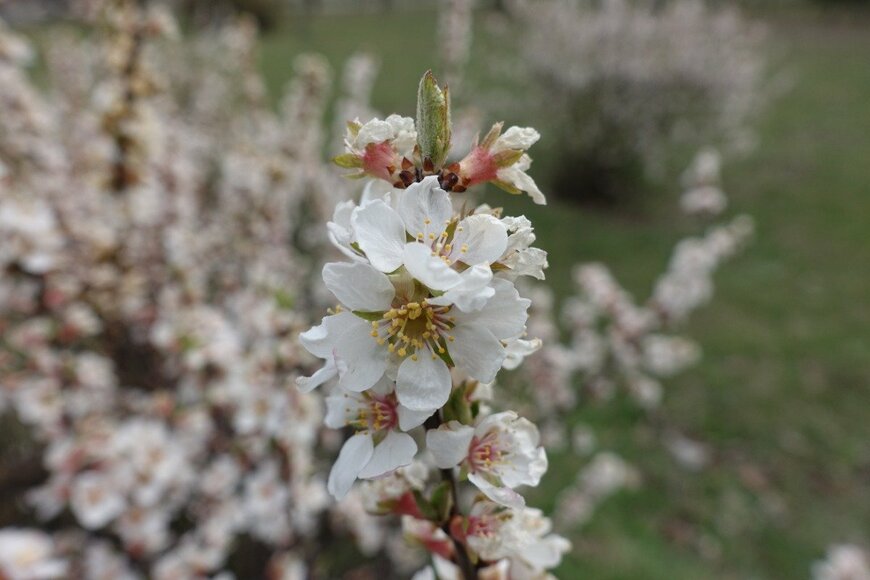 バラ科のユスラウメは春にウメに似た花を咲かせる落葉低木。淡いピンクの花は春らしく、まるで春の訪れを知らせてくれているかのようです。花後につく赤い実も可愛らしいですよ。