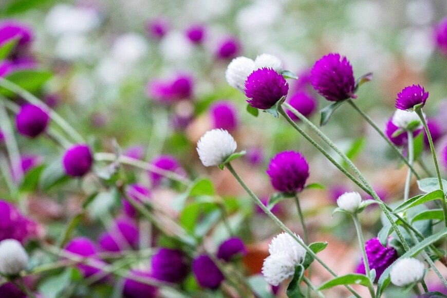 球形の花が可愛らしいセンニチコウは初心者も育てやすい一年草。開花期は5~11月で、長期間鑑賞できます。