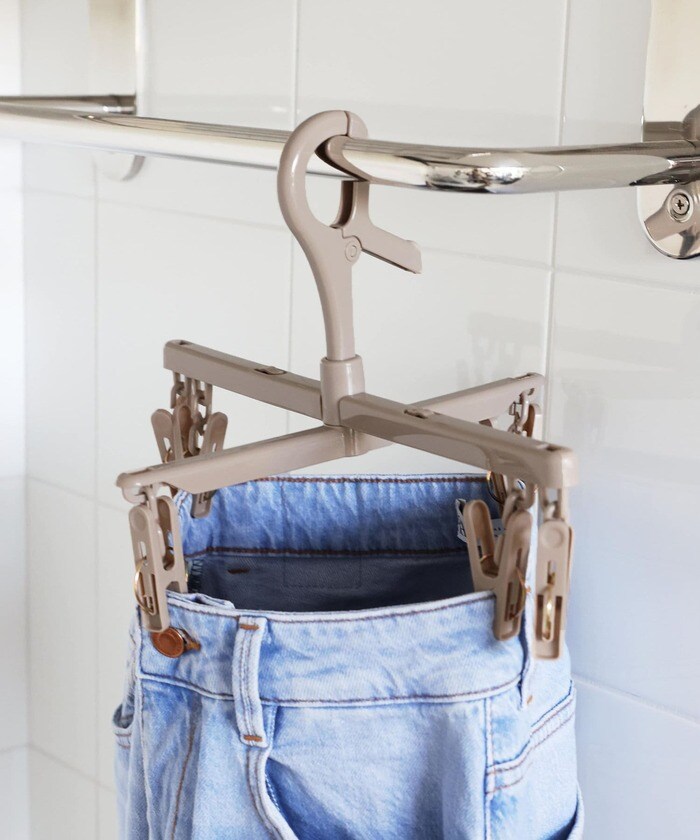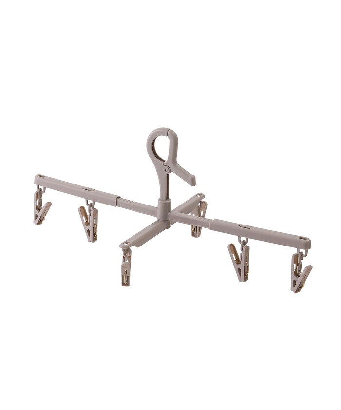 十字型になっているボトムハンガーです。ボトムスの胴周りを広げて、洗濯バサミ部分に挟むことで、空気が通り乾きやすくなります。伸縮部分を伸ばすことができるので、ボトムスの裾も挟めばさらに乾きやすさアップ!