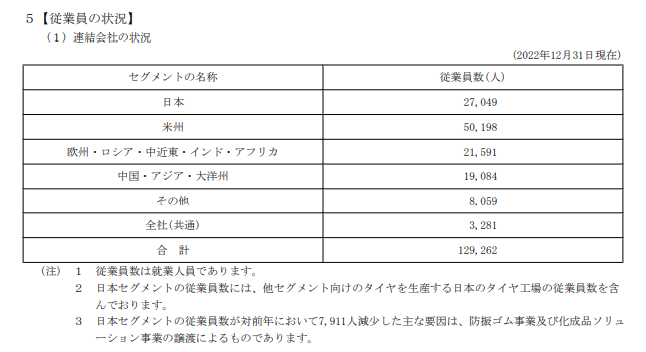 ブリヂストンの給料はいくらか。平均年齢・勤続年数も【2022年更新版】 就職と転職の企業調査・分析シリーズ 2023.04.08 03:50 公開 執筆者LIMO編集部 copy URL 目次[開く] 1. ブリヂストンの平均年間給与はいくらか 2. ブリヂストンの従業員数は何人か 3. まとめにかえて 参考資料 2. ブリヂストンの従業員数は何人か また、連結会社における従業員数は以下の通りです。 出所:株式会社ブリヂストン「有価証券報告書」 日本:2万7049人 米州:5万198人 欧州・ロシア・中近東・インド・アフリカ:2万1591人 中国・アジア・大洋州:1万9084人 その他:8059人 全社(共通):3281人 合計:12万9262人 3. まとめにかえて < 1 2 3 4 > 関連タグ #就職 #転職 #ブリヂストン #年収 注目コンテンツ 退院後の通院治療に3000円。通院保障がつけられる医療保険はこれ![PR] 【キャラつくAI】プロフィールをもとにAIがあなたをイメージして絵を描きます![PR] 三大疾病に備える!人気の三大疾病保険を比較[PR]