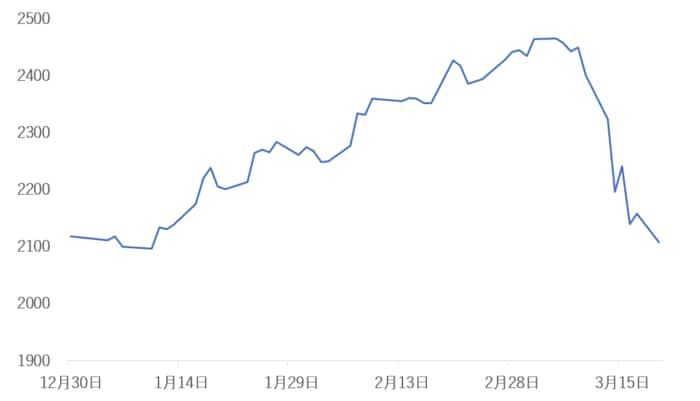 オリックスの2022年12月末以降の株価の推移(終値ベース:円)2022年12月30日~2023年3月20日