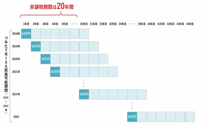 一般的に、投資などで得られた利益(分配金や譲渡益など)には税金がかかりますが、つみたてNISAの場合は毎年40万円まで、最長20年間にわたり(合計最大800万円まで)非課税になります。