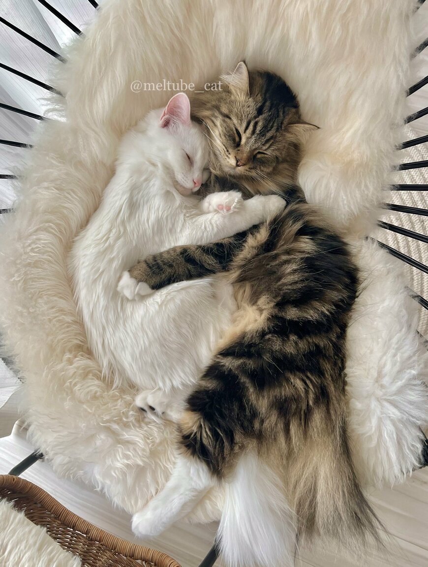 ギュッと寄り添い合うようにして眠る猫ちゃん達のようすがTwitterに投稿され注目を集めています。