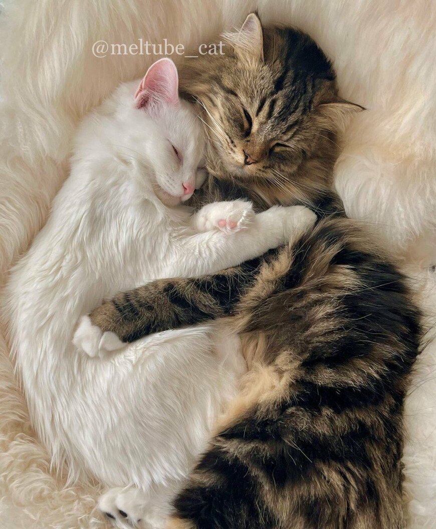 足を折りたたんで身体を丸めている様子のマオくん。メルくんはそこに足を添わせるような格好をしています。写真からも2匹の温もりが手に取るように伝わってきますね。