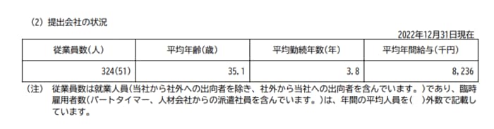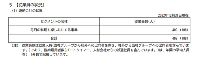 クックパッド(提出会社)の2022年12月末時点での従業員数、平均年齢、平均勤続年数および平均年間給与は以下の通りです。