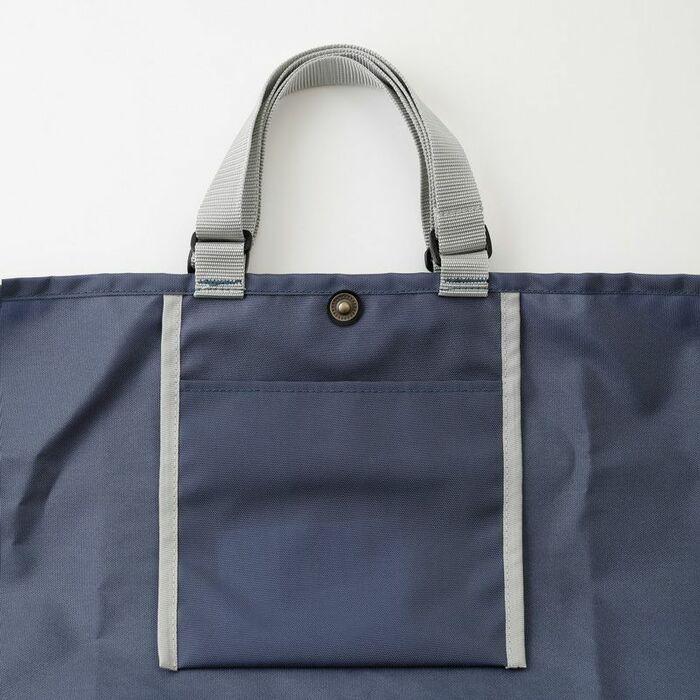 「紀ノ国屋 アジャスタブルストラップバッグ スモーキーブルー」は、持ち手の長さが調節できるショッピングバッグです。落ち着いた色味で仕事帰りのお買い物でも生活感を感じさせずに荷物を持ち運べます。