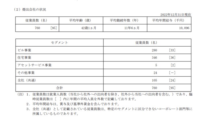 東京建物株式会社(提出会社)の2022年12月末時点での従業員数、平均年齢、平均勤続年数および平均年間給与は以下の通りです。